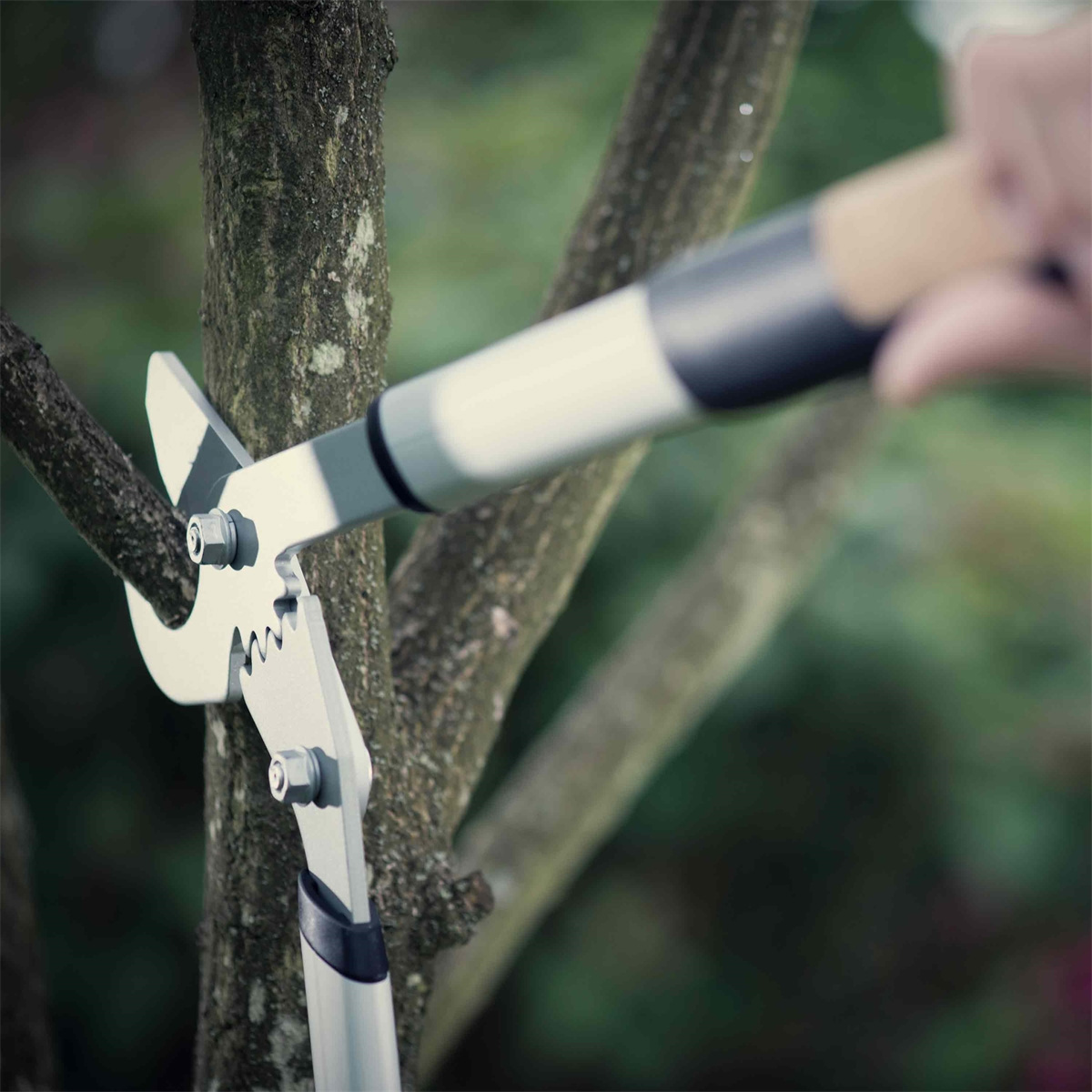 - Klingen: Antihaftbeschichtete Stahlklingen mit einer hakenförmigen Gegenklinge zur Fixierung des Astes.