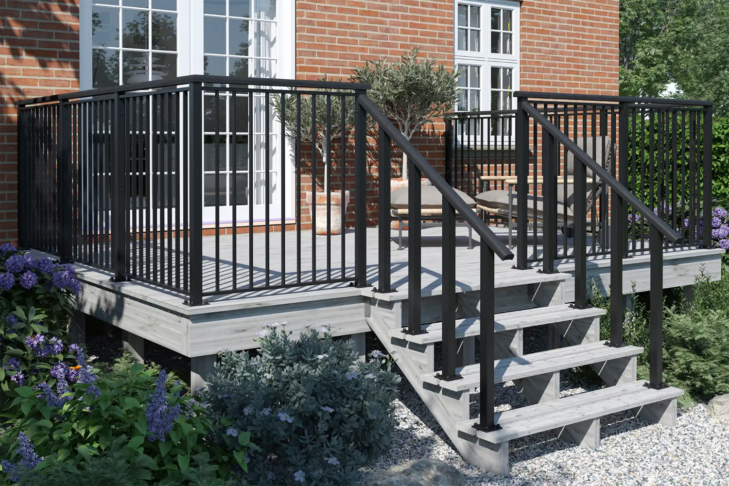 - Die Terrassentreppe überbrückt den Höhenunterschied zwischen Terrasse und Rasen