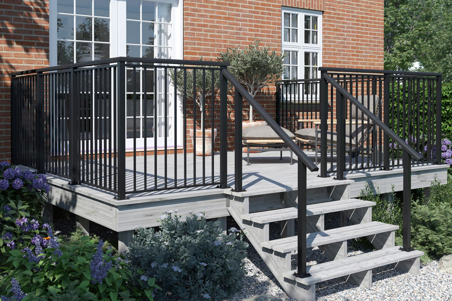 - Die Terrassentreppe überbrückt den Höhenunterschied zwischen Terrasse und Rasen