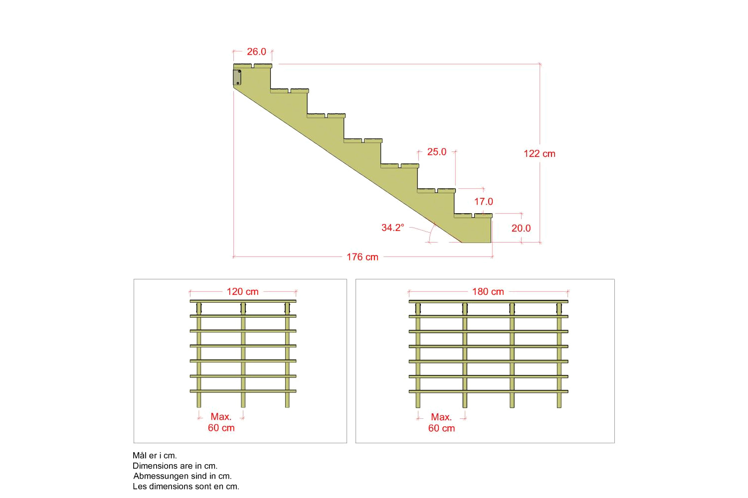 Die Normvariante mit dem Steigungswinkel von 34 Grad und der Tritt-Tiefe von 25 cm entspricht Standardabmessungen. Leichte Montage, Anleitung liegt bei. Im Bau-Set sind FSC* Holzwangen, passende FSC* Trittdielen, Beschläge sowie Kleinteile enthalten.