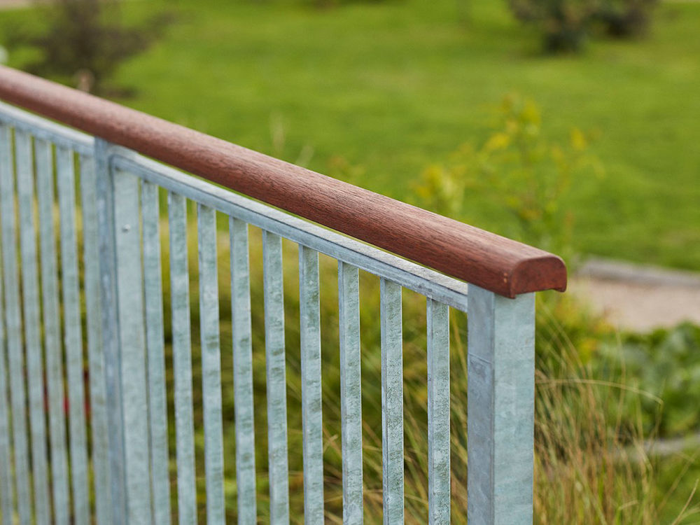 Exklusiv und edel. Das Geländersystem bestehend aus perfekt aufeinander abgestimmten Stahlpfosten, Montagebolzen, Kappen, Stahlgitter und Mahagoni Handlauf.