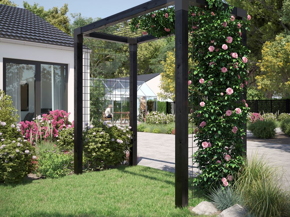 Modern oder romantisch? Ja, Beides. Der Cubic Rosenbogen in schwarz erfüllt beide Kriterien gleichermassen. Getragen von hochwertigen NTR-A Leimholzpfosten kommt das Rosentor mit ebenfalls schwarzen Stahlspalieren - für das Beranken mit Rosen oder allen anderen Arten von Rankpflanze wie alten Wein, Efeu oder Ähnlichen. Wenn gewünscht leicht mit weiteren Leimholzpfosten bzw. Cubic Beschlägen erweiterbar mit Pergola, Schaukel, Daylife Aufbau. Die neuen Produkte der Cubic / Daylife Serie sind hilfreiche Außenanlagen, sie verbessern den Alltag im Freien.