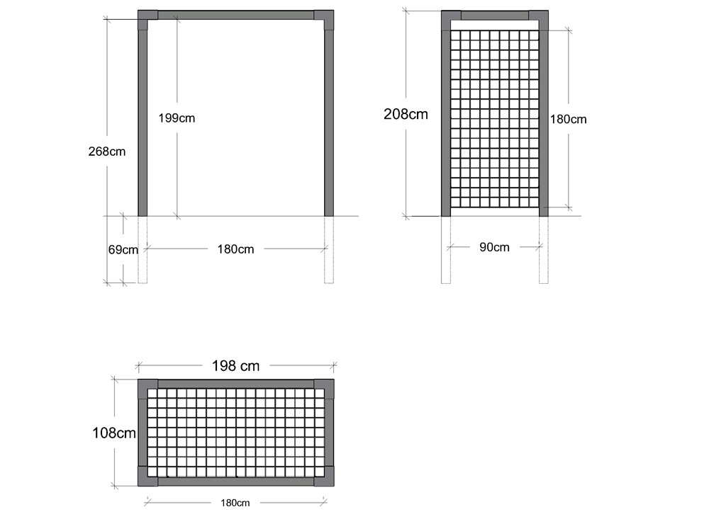 Komplettbausatz mit Cubic-Beschlägen, verzinkten Schrauben, Cubic-Trägern, Leimholzpfosten zum Eingraben, verzinkte Stahlspaliere, Einzelne Reckstangen / Turnstangen, Leimholzquerträger.